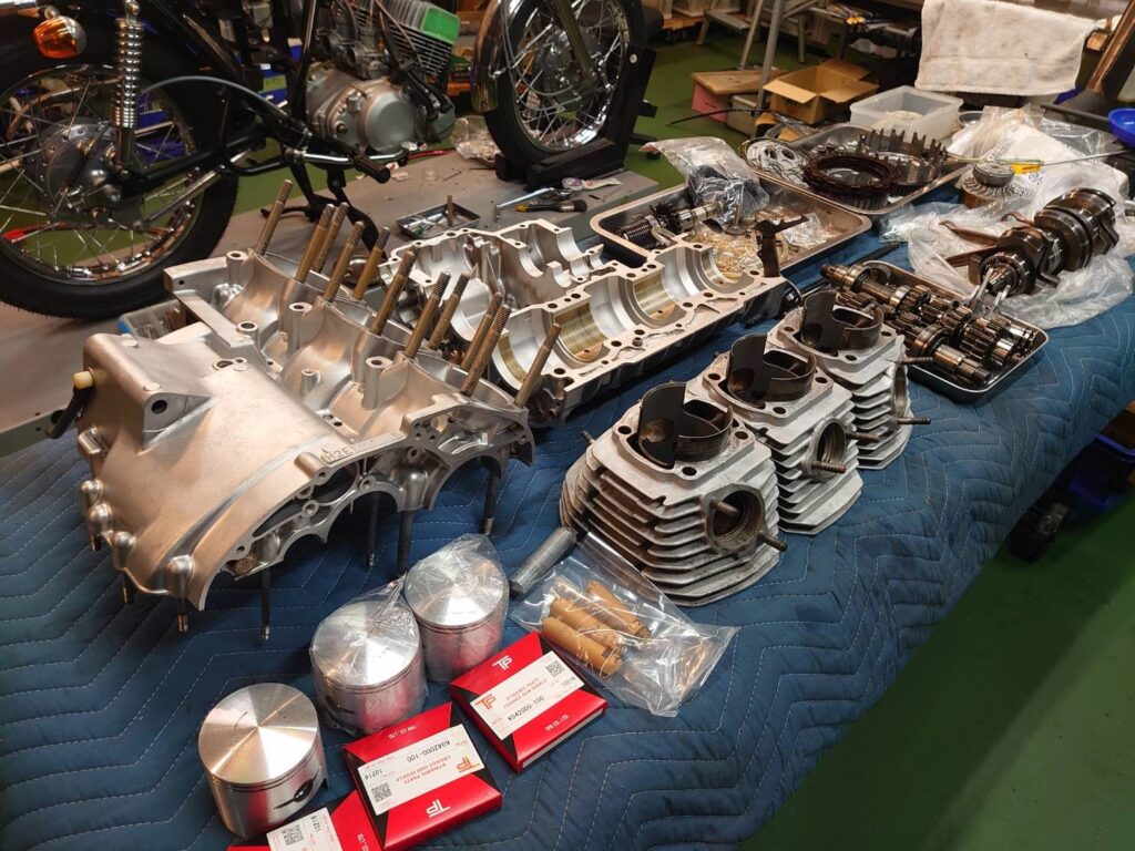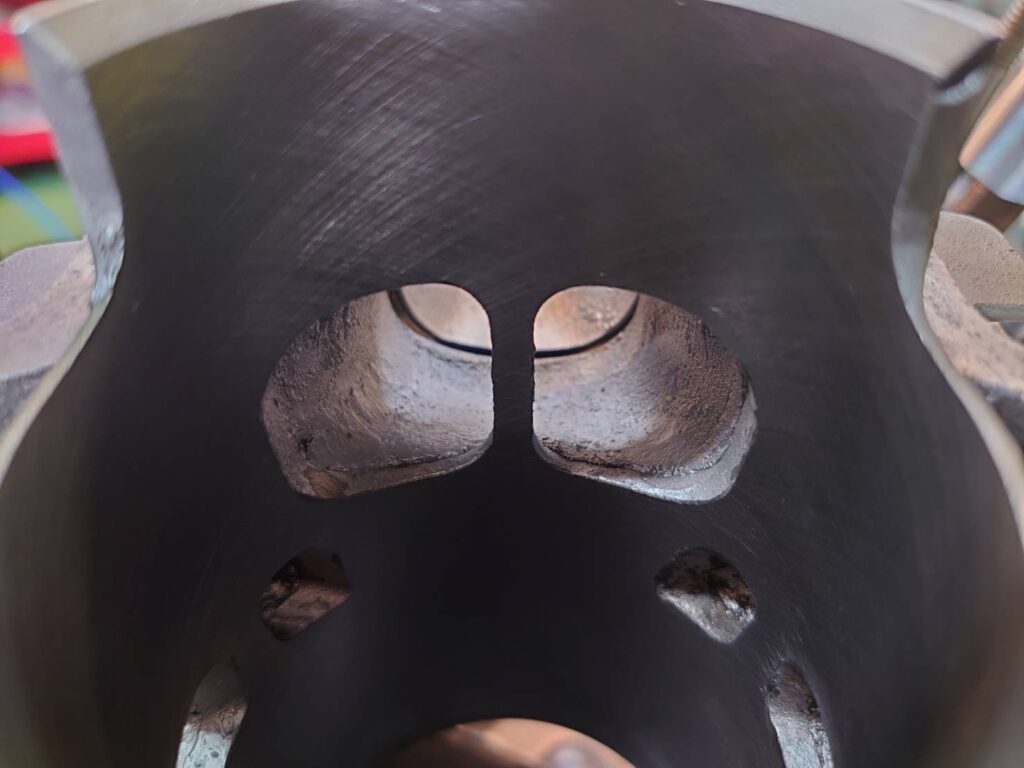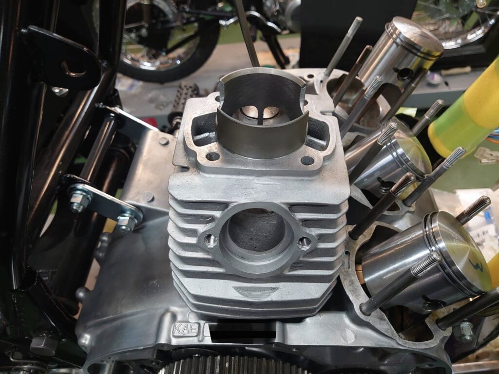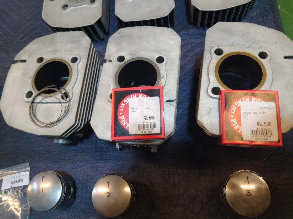 エンジンの圧縮低下や焼き付き跡がある場合、ピストンをオーバーサイズに入替えるかスリーブの打ち替え・ボーリング・ホーニング・ピストンの組み付けを行います。特に2ストロークエンジンでは一般的なオーバーホール作業です。その他にもシリンダー排気ポート清掃・排気バルブ部清掃・ピストン上部カーボン除去等行います。【作業車種:500SS MACH H1】