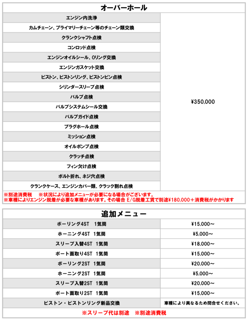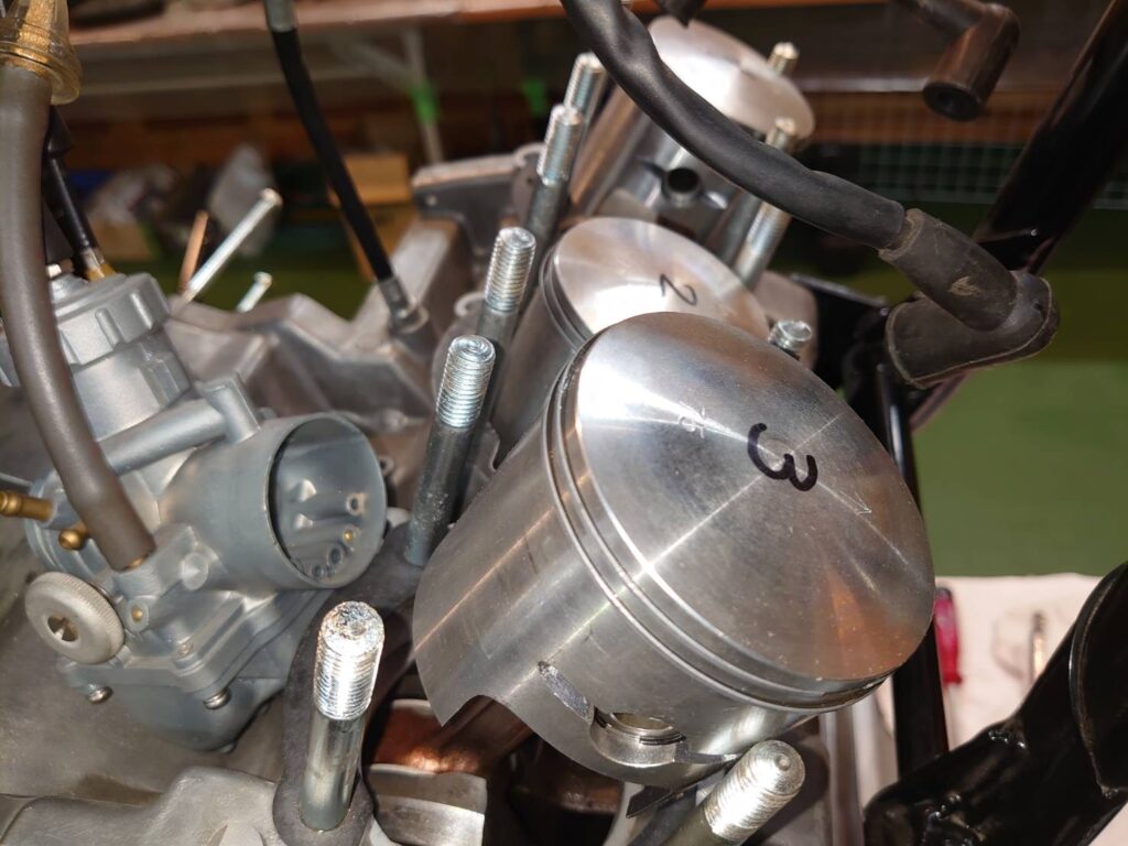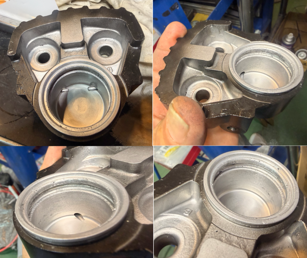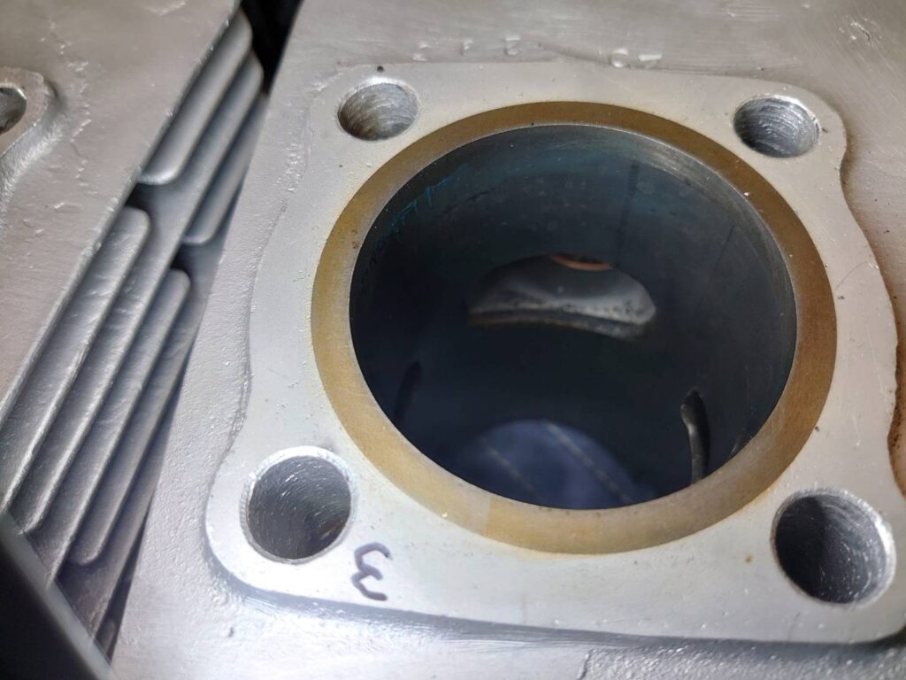 エンジンの圧縮低下や焼き付き跡がある場合、ピストンをオーバーサイズに入替えるかスリーブの打ち替え・ボーリング・ホーニング・ピストンの組み付けを行います。特に2ストロークエンジンでは一般的なオーバーホール作業です。その他にもシリンダー排気ポート清掃・排気バルブ部清掃・ピストン上部カーボン除去等行います。【作業車種:500SS MACH H1】