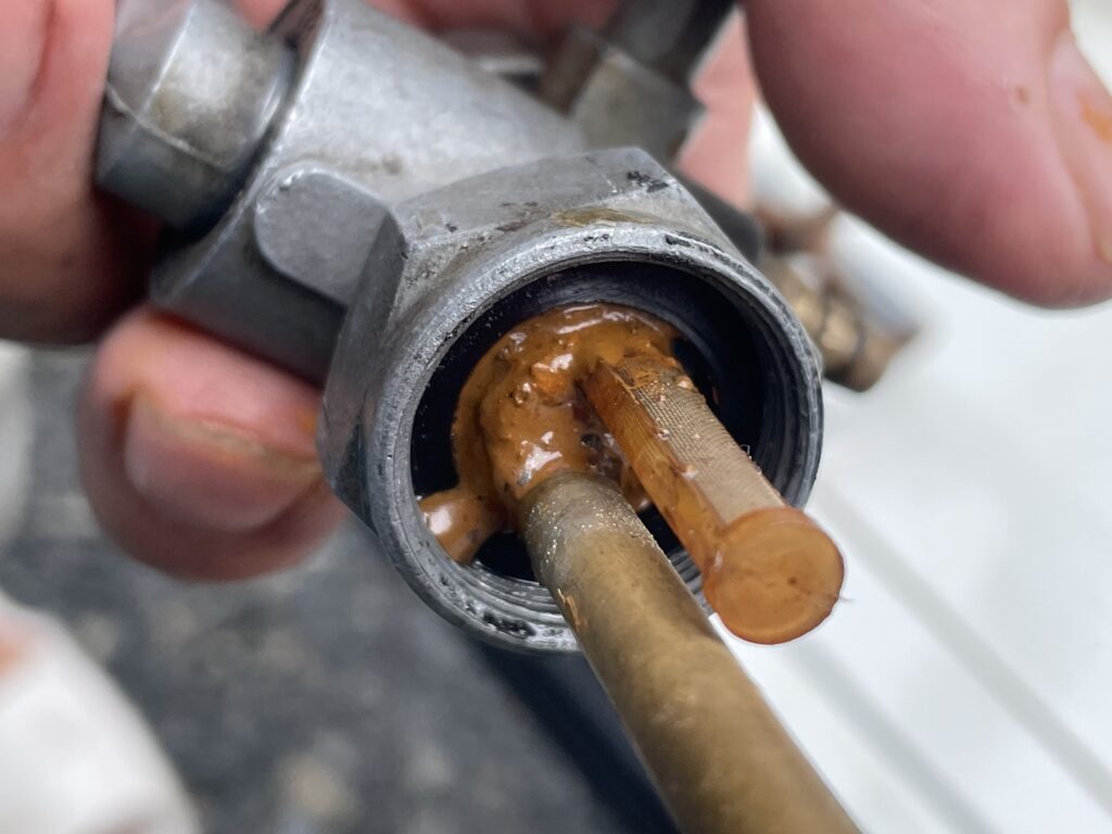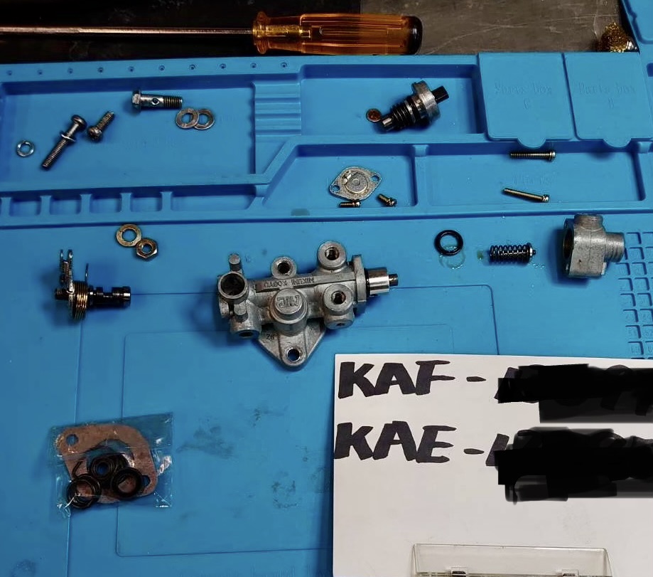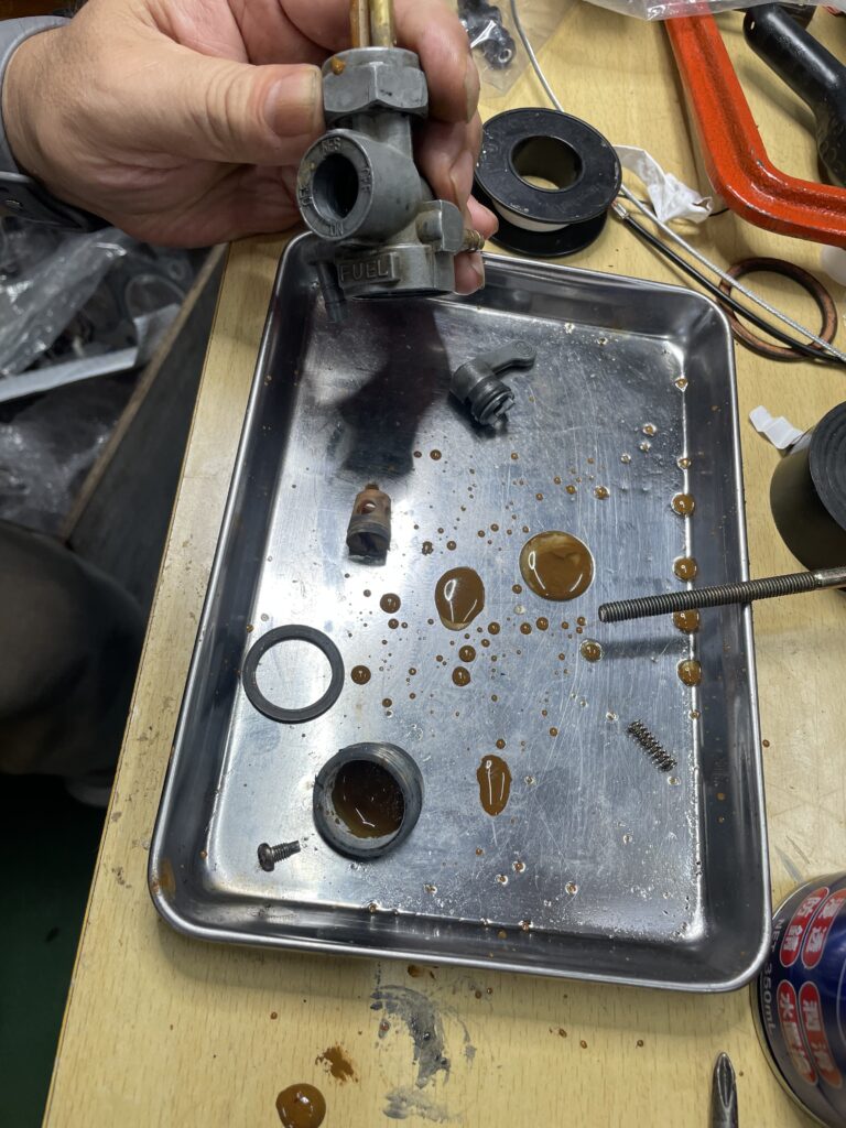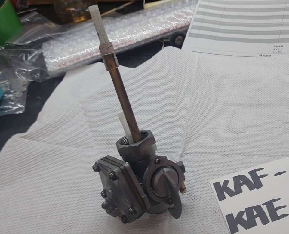旧車MACHやZ系車両では長年の使用や放置によりガソリン漏れ・ガソリンが出ない・RESが効かないなどのタンクコック不良がよく起こります。コックを分解し各部点検を行い各通路を洗浄・フィルター交換・真鍮パイプの打ち替え・歪取り・ダイヤフラムカバー、タンクコックノブ側の面出し・ユニクロメッキ・Oリング、ガスケット、シール交換などを行い組み立て・漏れチェックをします。【作業車両 : 500SS MACH H1】