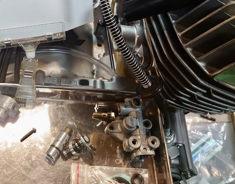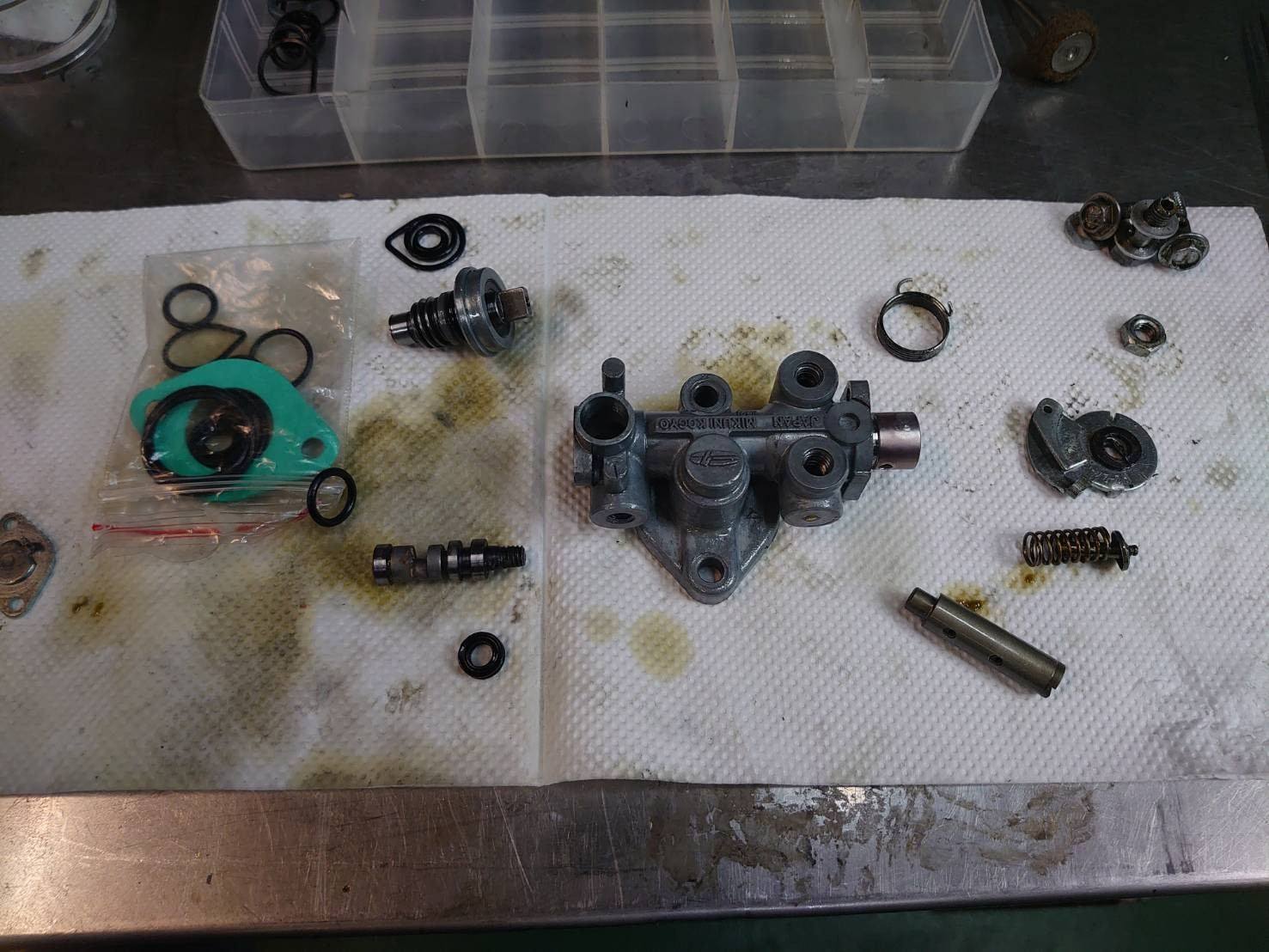 ポンプをエンジンから取り外し分解して内部の状態を確認します。点検箇所・ポンプシャフトの回転・内部ローターの摩耗・オイルシール・Oリング・チェックバルブなどを点検し、洗浄・消耗部品交換などを行います。【作業車種 : 500SS MACH H1 】