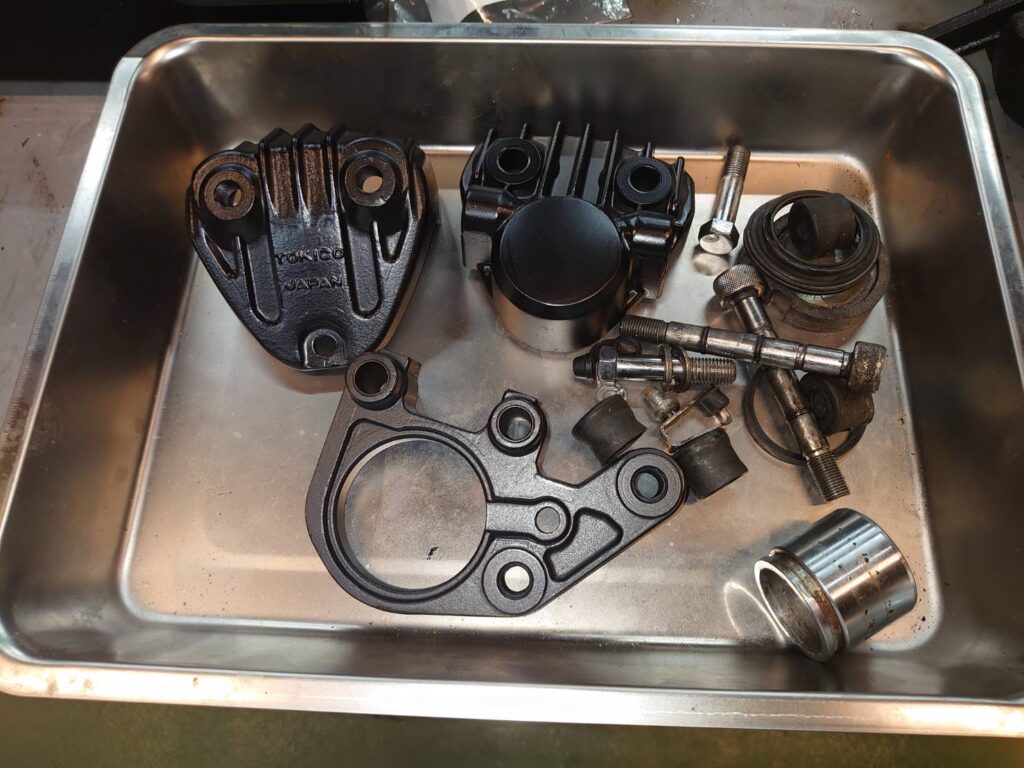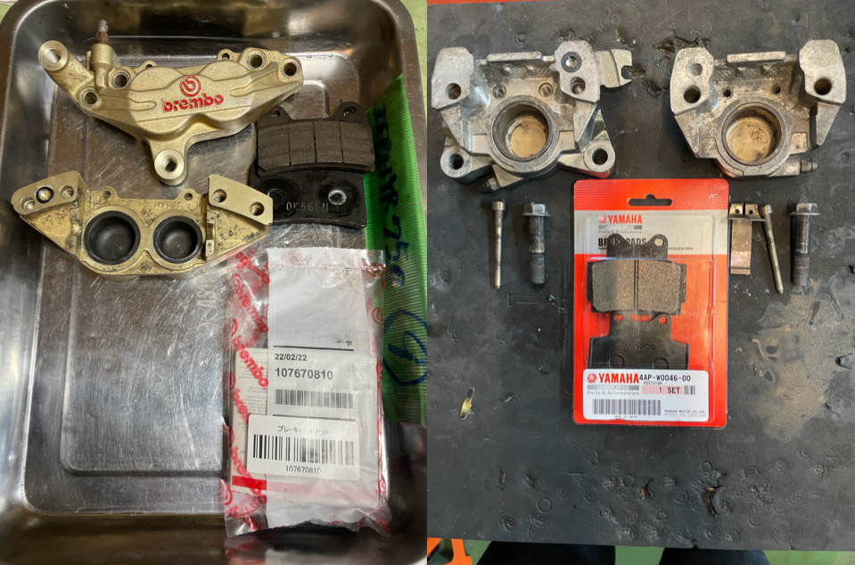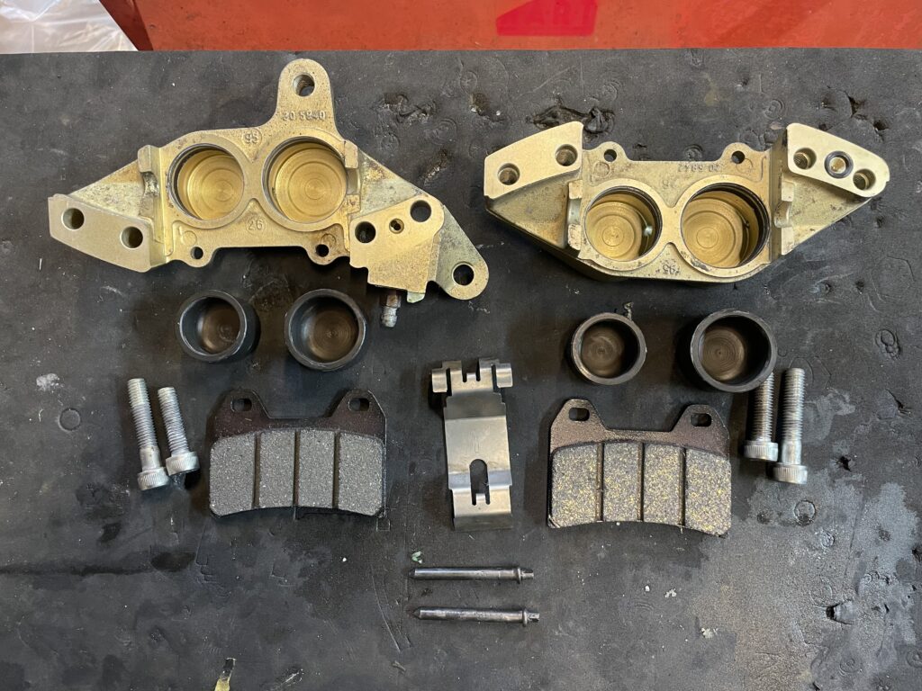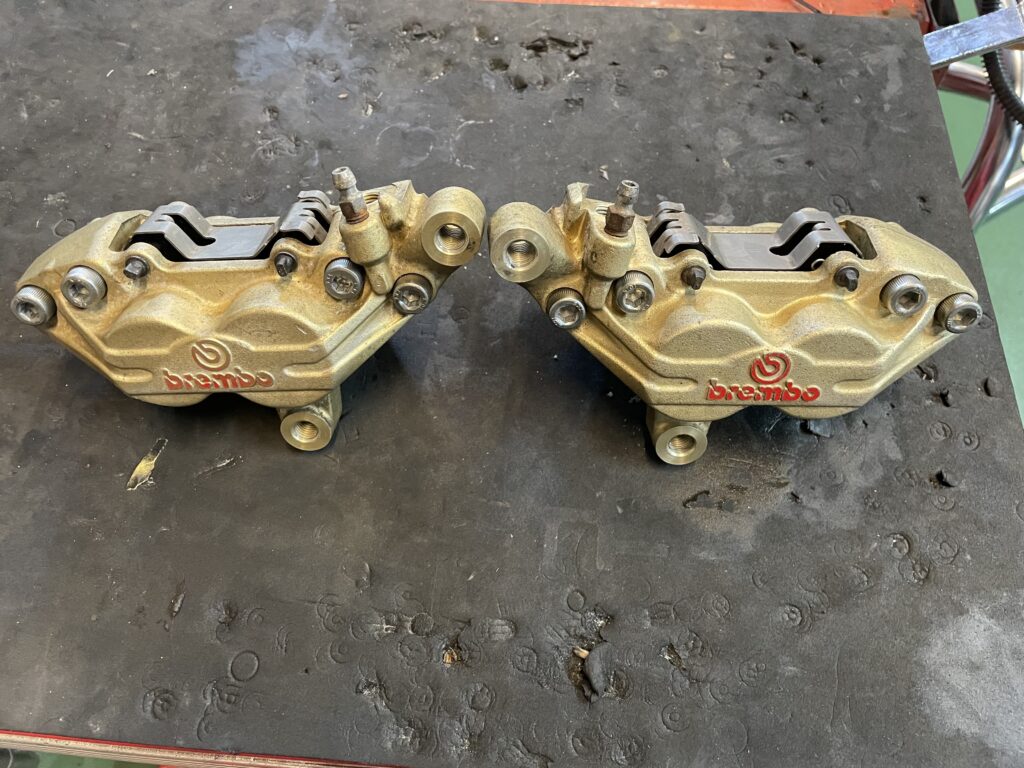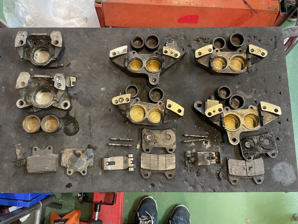 ブレーキキャリパーは長年使用するとピストン固着・オイル漏れ・ブレーキの引きずりが起きるため、定期的なオーバーホールが必要です。まずはキャリパーを取り外し、キャリパーを分解し、各部品を外します。そしてピストンを取り外し清掃します。 ①清掃はシール溝(溝に溜まった腐食白サビを除去します)・ピストン表面・フルード通路 ②部品点検 ・ピストンのサビ・キャリパーの内部腐食・パットの摩耗・スライドピン状態(ピンが錆びている場合は交換します)③シール交換 ・オイルシール・ダストシール・Oリング・ブレーキパッド(必要に応じて)④組み立て ⑤エア抜きです。 お客様の希望によりキャリパー塗装も施します。【作業車両:XJR400】