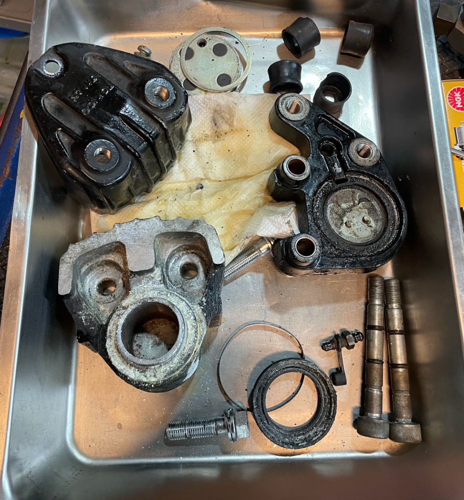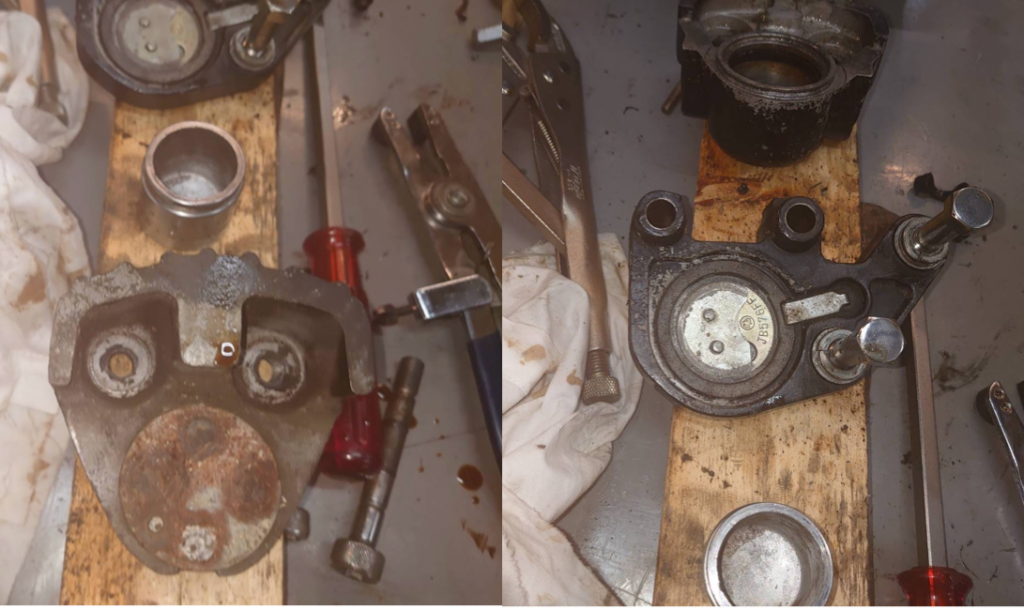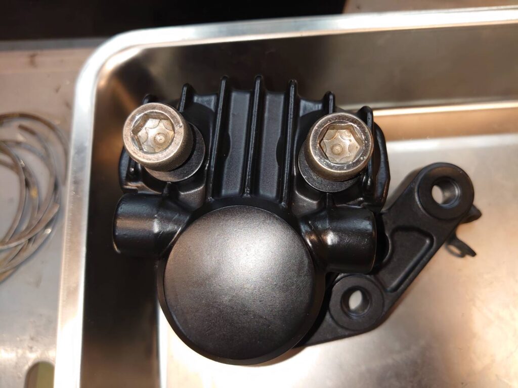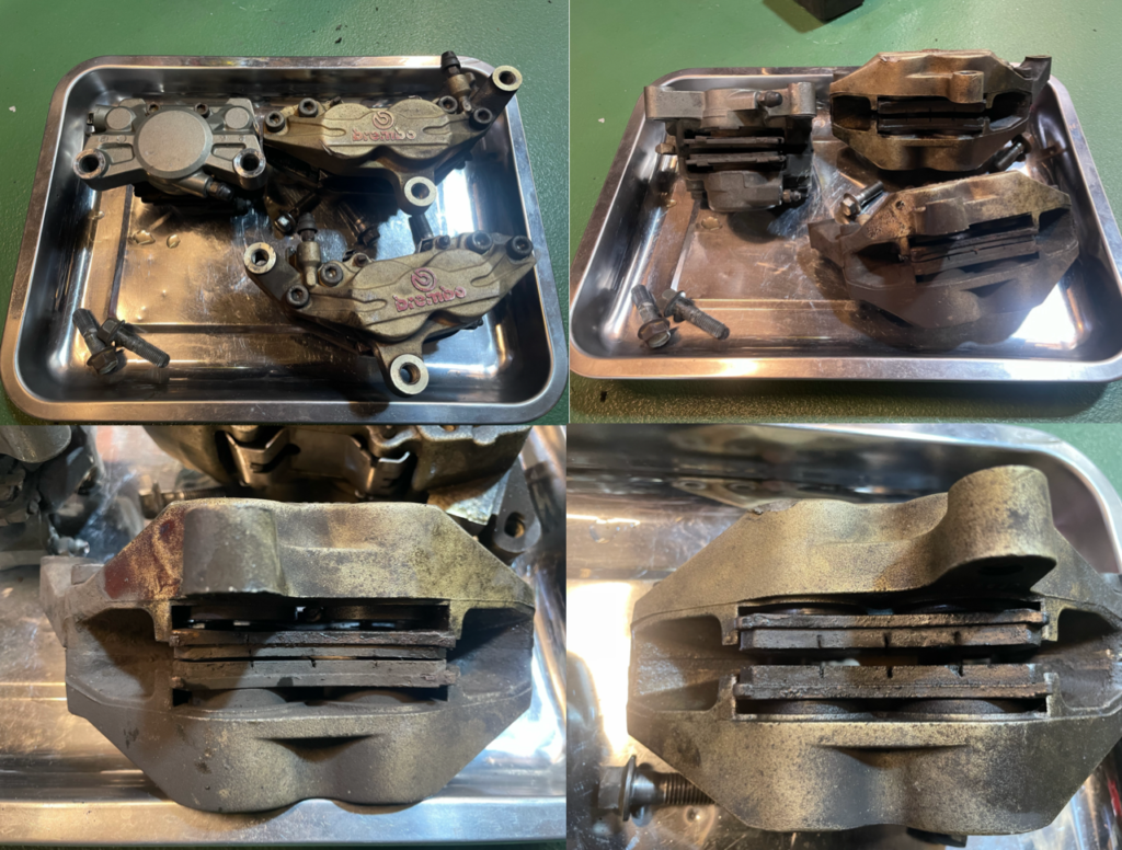 ブレーキキャリパーは長年使用するとピストン固着・オイル漏れ・ブレーキの引きずりが起きるため、定期的なオーバーホールが必要です。まずはキャリパーを取り外し、キャリパーを分解し、各部品を外します。そしてピストンを取り外し清掃します。 ①清掃はシール溝(溝に溜まった腐食白サビを除去します)・ピストン表面・フルード通路 ②部品点検 ・ピストンのサビ・キャリパーの内部腐食・パットの摩耗・スライドピン状態(ピンが錆びている場合は交換します)③シール交換 ・オイルシール・ダストシール・Oリング・ブレーキパッド(必要に応じて)④組み立て ⑤エア抜きです。 お客様の希望によりキャリパー塗装も施します。【作業車両:XJR400】