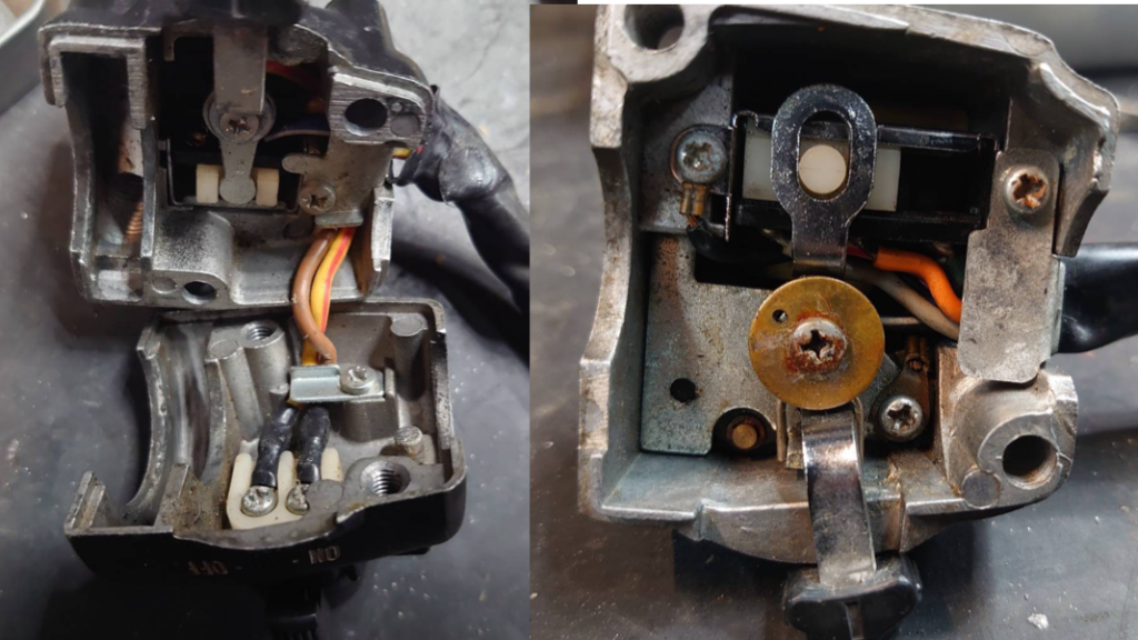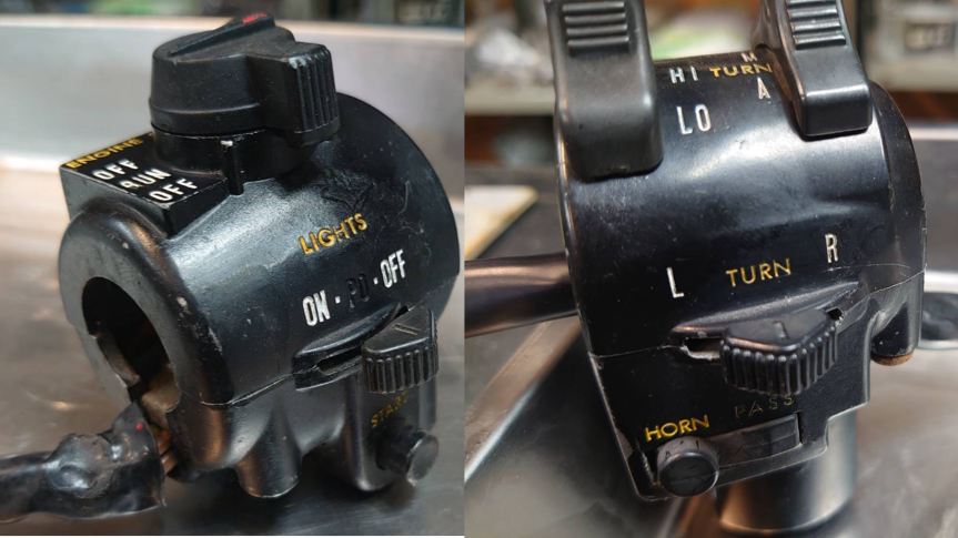 旧車では接点不良や固着でランプが点灯しないことがあります。原因の多くは接点不良・スプリング固着・配線断線などが多いです。スイッチを取り外し分解して接点の掃除・内部サビ、腐食箇所、配線の断線などを確認し、必要に応じて内部金属部品はユニクロメッキ、ユニクロメイトを施し、動作確認後取り付けます。また、希望によりスイッチのケースの塗装、文字溝に色差しなども施します。 【作業車種:Z900 Z-1】