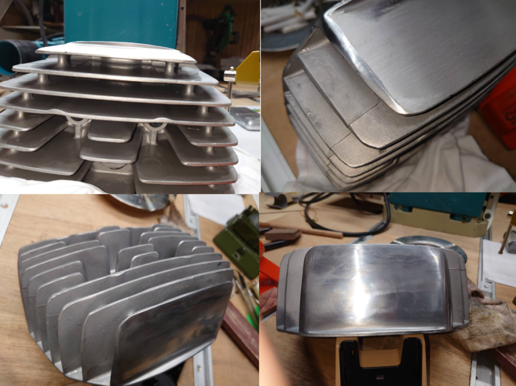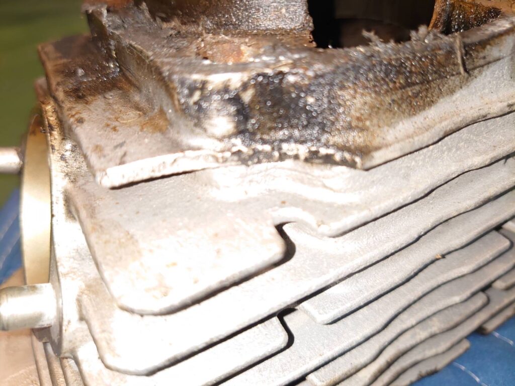 フィン欠け修理 ①溶接修理(アルミ肉盛り)欠けた部分にアルミ溶接して形を作ります。②フィン形成加工 溶接後にフィン形状を削り出して整えます。【作業車種 : 500SS MACH H1】