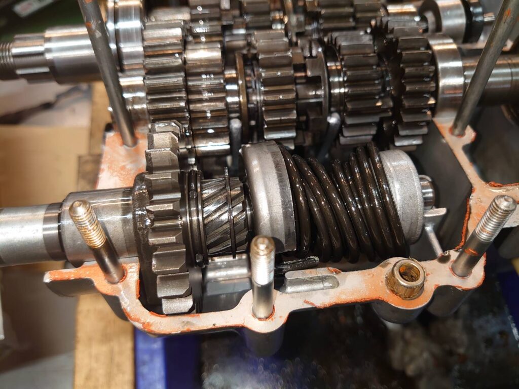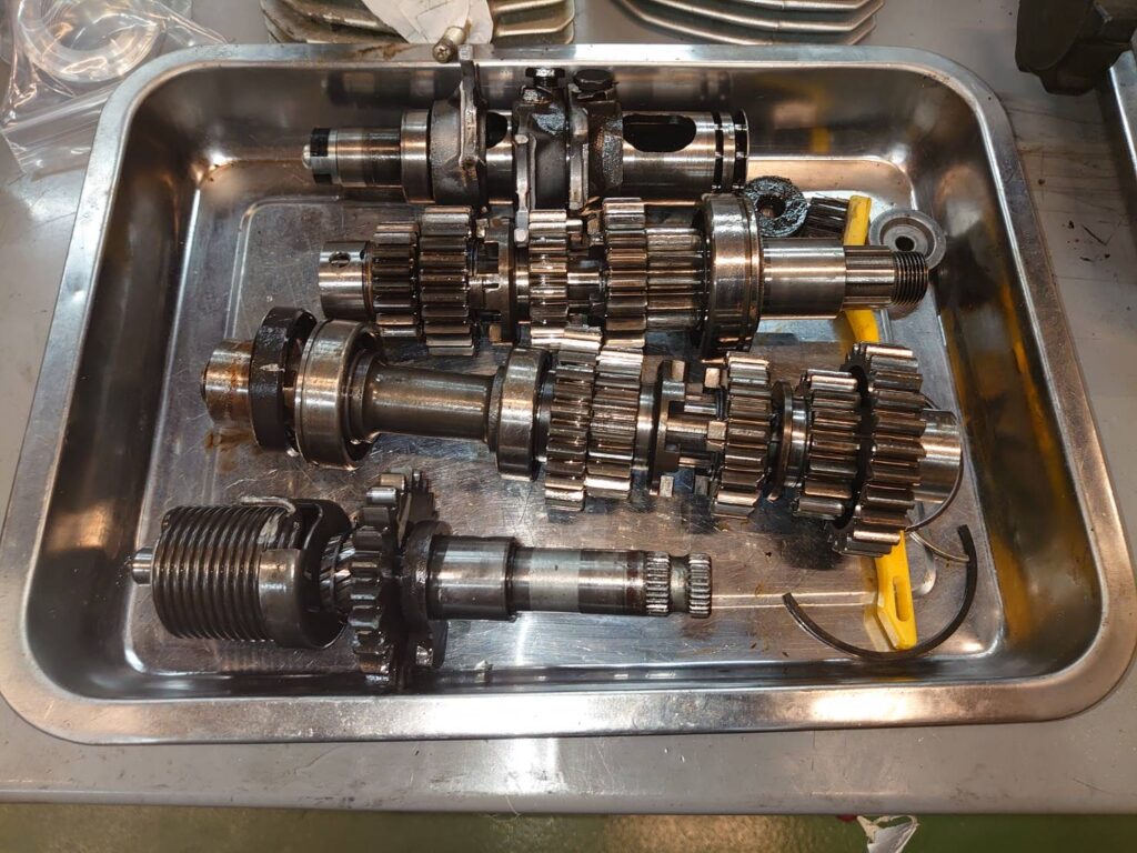 【オーバーホール作業】 エンジンを取り外しクランクケース分解して・メインシャフト・カウンターシャフト・ギアセット・シフトフォーク・シフトドラムを取り出し、部品をチェックします。 点検はギア歯面摩耗・ドック摩耗・シフトフォーク曲がり・ベアリング摩耗など 次に消耗部品の交換・ミツションベアリング・シフトフォーク・スナップリング・オイルシールなど。ギアに摩耗があれば交換し、各ギア間のクリアランスを調整しながら組み直します。【作業車種 : 500SS MACH H1】