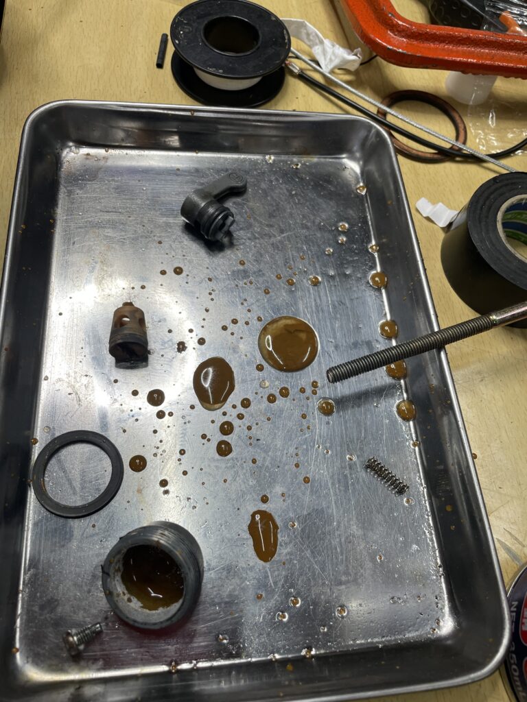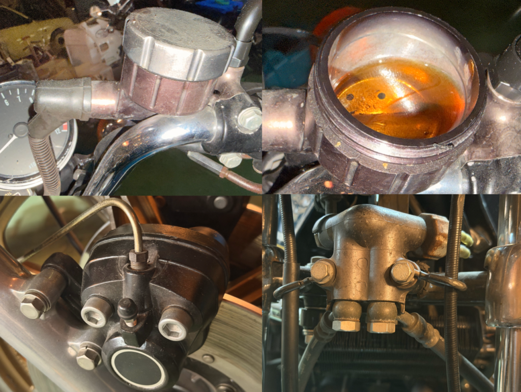 旧車ではゴム部品の劣化や内部腐食で不具合が起きやすく、よくある症状として・ブレーキレバーがスカスカ・レバーを握っても効きが弱い・フルード漏れ・レバーを離しても戻りが悪いなどの症状が出ます。また、長期間フルード未交換の場合やマスターシリンダー内に湿気や水分が混入している場合フルードが白く濁りミルク状に乳化しブレーキの固着や効きに影響します。
