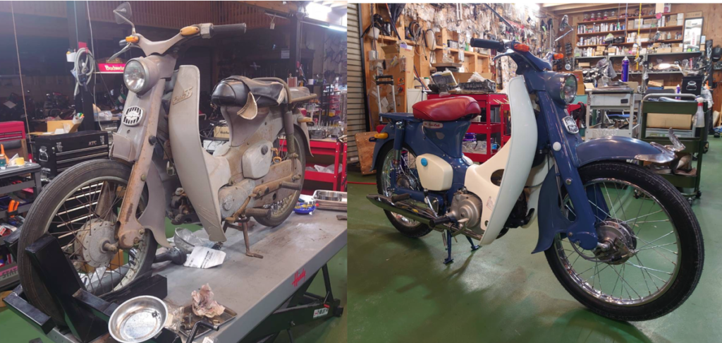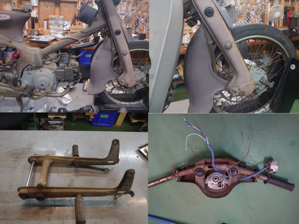 【塗装工程】 ①旧塗装の剥離・サンドペーパー研磨・剥離剤・サンドブラスト ②下地処理・パテ修正・板金修正・サフェーサー塗装・表面研磨 ③カラー塗装 ④クリア塗装などです。【作業車種 : HONDA C105 フルレストア車両 塗装工程】